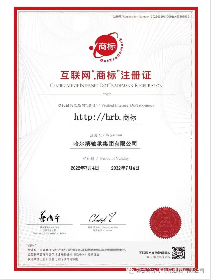 祝賀哈爾濱軸承集團有限公司喜獲互聯網“商標”注冊證